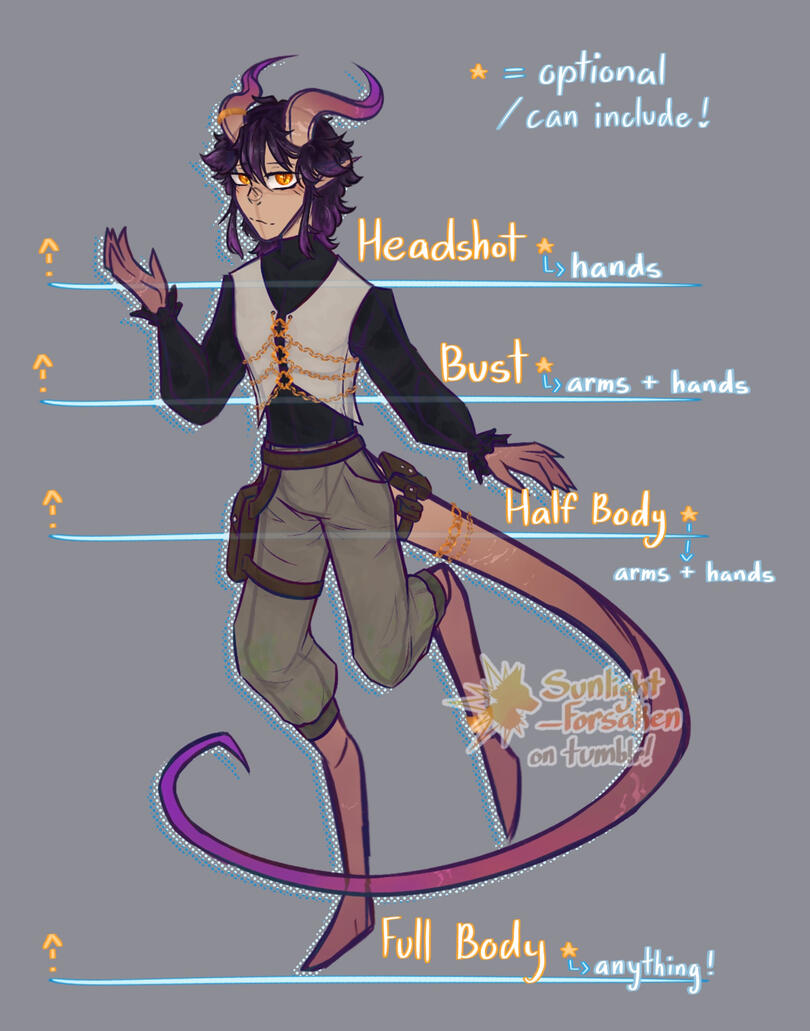 What you want: (refs and info of your character, moodboards or ideas if its a custom, pose and expression info, etc! please also lmk if there's any extra important details I pay extra attention to)